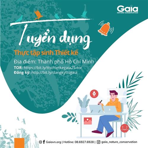 TÌM THỰC TẬP SINH TRUYỀN THÔNGGaia Nature Conservation (Trung tâm Bảo tồn thiên nhiên Gaia) là tổ chức phi lợi nhuận của Việt Nam. Gaia trao quyền và thúc đẩy thực hiện các hoạt động bảo tồn thiên nhiên, bảo vệ môi trường nhằm tạo dựng một tương lai nơi con người sống hòa hợp với Mẹ Trái Đất (Gaia). Các chương trình hoạt động chính của Gaia hiện nay gồm: Trồng rừng, trải nghiệm thiên nhiên, kết nối cộng đồng, rác thải nhựa.