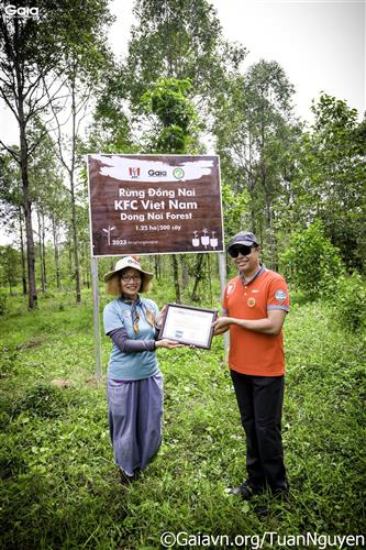 i diện Gaia trao giấy chứng nhận góp rừng cho đại diện KFC