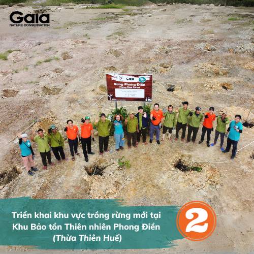 Trong ảnh là một trong các khu vực trồng rừng Phong Điền, nơi hoàn toàn trống trọc do bị khai thác trong quá trình xây dựng đường cao tốc La Sơn - Cam Lộ. Hoạt động trồng rừng đánh dấu bước ngoặt Gaia mở rộng khu vực trồng rừng mới tại Khu Bảo tồn Thiên nhiên Phong Điền. Mùa trồng rừng Phong Điền đầu tiên có sự tham gia của của đại diện công ty FPT Japan Holdings (áo cam), cán bộ Khu BTTN Phong Điền (áo xanh lá) và cán bộ Gaia (áo xanh ngọc).