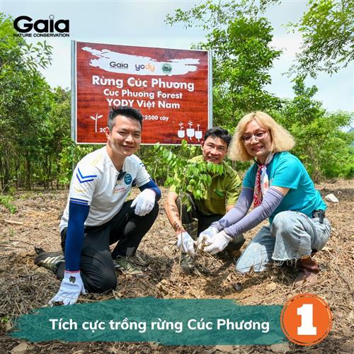 Trong ảnh từ trái sang là anh Nguyễn Việt Hòa (CEO Công ty thời trang YODY), anh Bùi Thanh Nam (Cán bộ Kỹ thuật Vườn quốc gia Cúc Phương) và bà Huyền Đỗ (Nhà Sáng lập & Giám đốc Trung tâm Bảo tồn Thiên nhiên Gaia) đang trồng cây Sưa đầu tiên của khu rừng Yody tại rừng Cúc Phương.