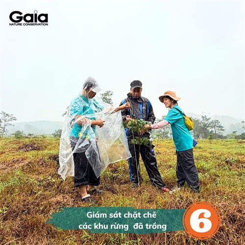 Công tác chăm sóc rừng bao gồm nhiều hoạt động thiết thực như vun gốc, cắt dây leo, bón phân nhằm tạo điều kiện tốt nhất cho cây sinh trưởng. Song song đó, Gaia triển khai giám sát khoa học thông qua việc đếm cây theo ô tiêu chuẩn hoặc kiểm kê toàn bộ cây tại các khu rừng như Đồng Nai, Tà Kóu, kết hợp đo chiều cao, đường kính gốc, chụp ảnh cây và cảnh quan. Riêng tại các khu rừng ngập mặn như Cà Mau, Gaia ứng dụng drone để giám sát diện rộng, đảm bảo dữ liệu đầy đủ và khách quan.