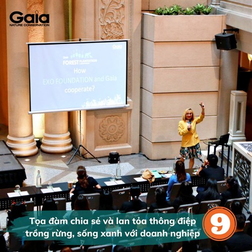 Trong năm 2025, Gaia đã phối hợp tổ chức nhiều tọa đàm, buổi chia sẻ và chương trình nâng cao nhận thức xoay quanh các chủ đề như trồng rừng ứng phó với biến đổi khí hậu, sống xanh trong môi trường doanh nghiệp, và vai trò của cộng đồng trong bảo tồn thiên nhiên. Các hoạt động này được triển khai cùng nhiều đơn vị và doanh nghiệp như JTI, Starbucks, Techcombank, Vinschool, Gremsy,… góp phần đưa các khái niệm về phát triển bền vững, ESG và bảo vệ môi trường trở nên cụ thể, dễ hiểu và dễ hành động hơn.